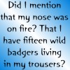 Description: "Did I mention that my nose was on fire? That I have fifteen wild badgers living in my trousers?" - Babylon 5